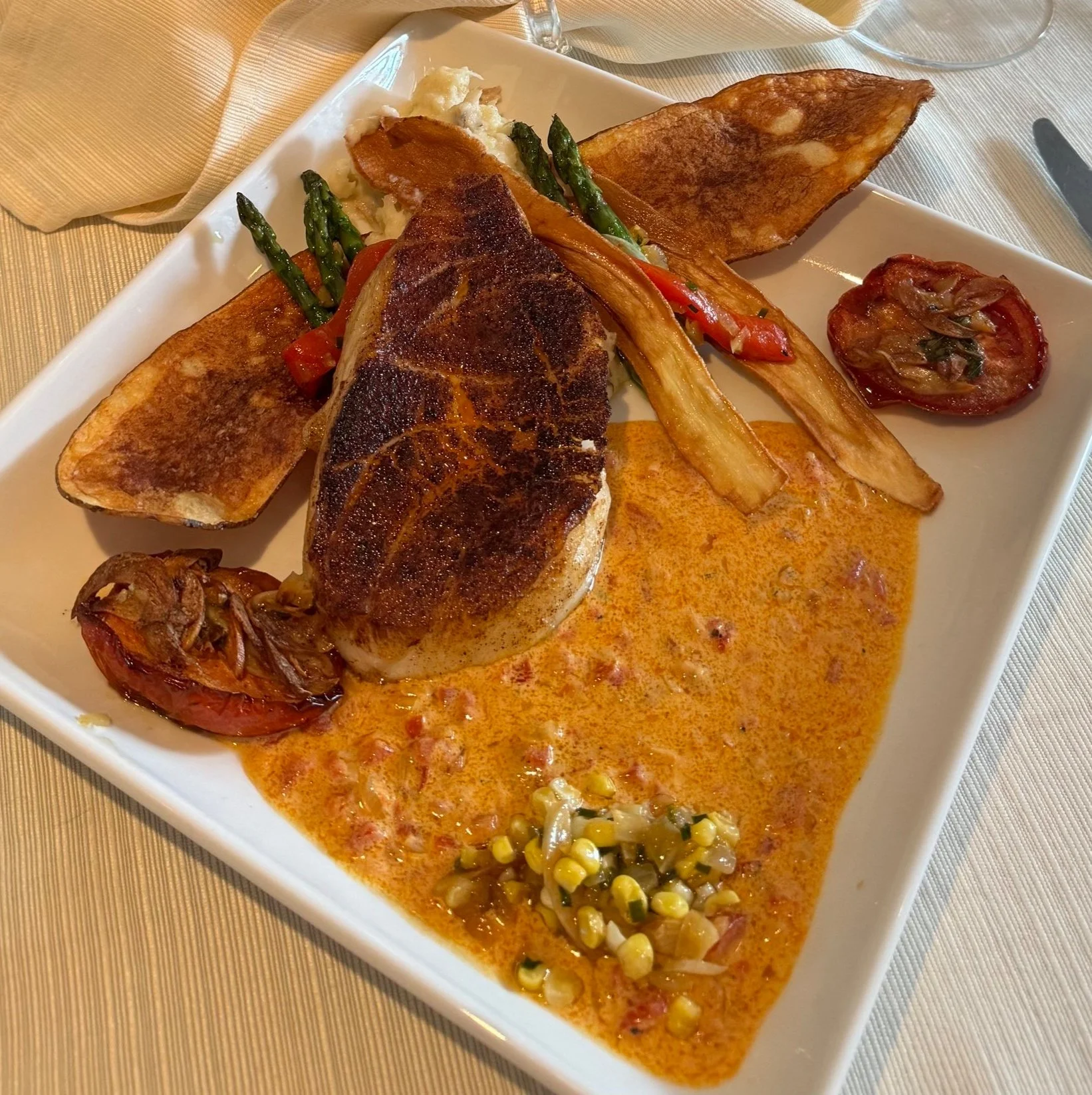 Roasted garlic sauce and roasted plum tomato with choice of a variety of potato dishes and choice of seasonal veggies.